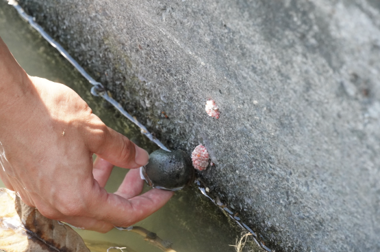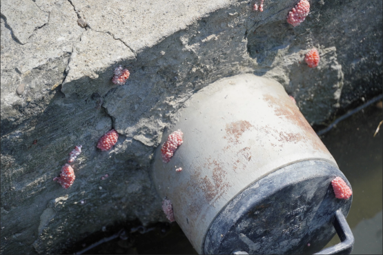 | Figure 6. Apple snails and apple snail eggs. These apple snails and apple snail eggs are all on the ditch walls. |