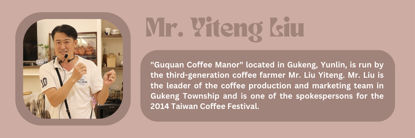 "Guquan Coffee Manor" located in Gukeng, Yunlin, is run by the third-generation coffee farmer Mr. Liu Yiteng. Mr. Liu is the leader of the coffee production and marketing team in Gukeng Township and is one of the spokespersons for the 2014 Taiwan Coffee Festival.