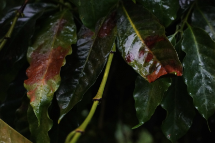 | Figure 8. how the coffee bean leaves are sunburned. Many brown areas are sunburned locations. |