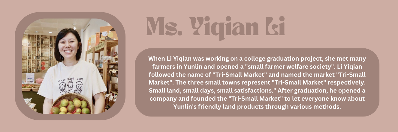 When Li Yiqian was working on a college graduation project, she met many farmers in Yunlin and opened a "small farmer welfare society". Li Yiqian followed the name of "Tri-Small Market" and named the market "Tri-Small Market". The three small towns represent "Tri-Small Market" respectively. Small land, small days, small satisfactions." After graduation, he opened a company and founded the "Tri-Small Market" to let everyone know about Yunlin's friendly land products through various methods.